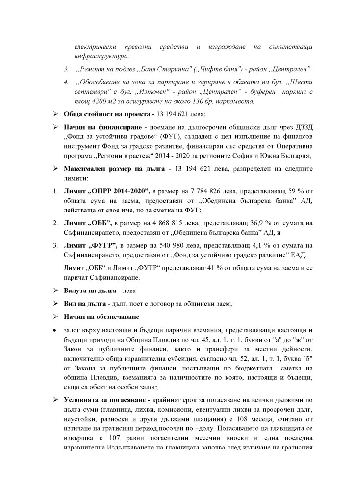 - При положение че не оттегли предложението си, направих предложение да се допълни точка първа, като се прибави „към Европейска инвестиционна банка“ – да е изрично решено, че съгласието е само за тази банка, към която да поемем дълг. Странното е, че след като бивахме горещо увещавани от съветници на ГЕРБ, Съюз за Пловдив и Кауза Пловдив колко изгодни са условията на тази банка, че никоя друга финансова институция не предлага такива и че ще сме луди да не се възползваме, не „заковахме“ в решението именно тази банка – предложението ми не се прие и си остана съгласие за включване на такъв лимит по принцип. Тук ще припомня и едно скоростно проведено в сезона на летните отпуски обществено обсъждане за друг дългосрочен общински дълг – за около 15 млн. лв., които ще връщаме на ОББ. Това на фона на 120 млн. ще ни изглежда доста по-приемливо, а ще имаме предвиден принципен лимит в бюджета от 120 млн. и тази административна пречка за поемане на дълг няма да съществува (нищо, че не е при онези изгодни условия на Европейската инвестиционна банка).