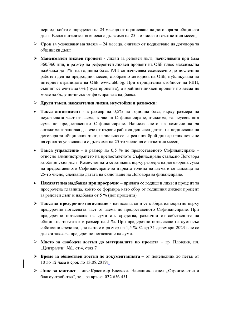 2. Дава съгласие да се стартират преговори с Европейската инвестиционна банка и да се подаде искане до банката за определяне размера на рамката за финансиране на инвестиционни проекти на Община Пловдив (допустим размер на сума за ползване) по кредитна линия до 120 млн. лв., при лихвен процент под 1%, гратисен период до 7 години, със срок на изплащане и погасяване на дълга до 25 години.